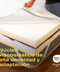 - Deze topper is gemaakt met visco -elastisch schuim met hoge dichtheid die zich aanpast aan de vorm van uw lichaam en druk biedt door druk in de belangrijkste punten van uw anatomie. Bovendien is de voering verwijderd en wasbaar, zodat u het langer schoon en vers kunt houden. De voering wordt gemaakt met ademende materialen die de ventilatie van de topper en bijgevolg de temperatuurregeling bevorderen.